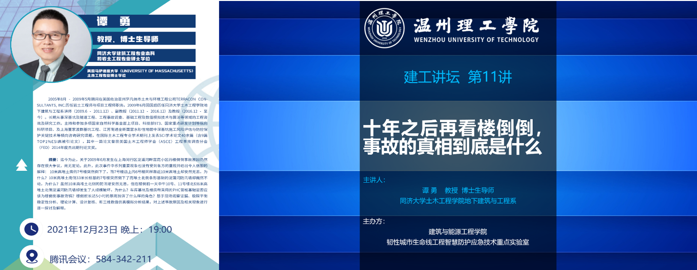 建筑与能源工程学院于2021年12月23日星期四晚上,在线上举办了建工讲坛第11讲专家讲座,邀请了同济大学谭勇教授为建工讲坛第11讲专家,题为“十年之后再看楼倒倒,事故的真相到底是什么”。讲座由建筑与能源工程学院和韧性城市生命线工程智慧防护应急技术重点实验室共同主办,由建筑与能源工程学院副院长兼韧性城市生命线工程智慧防护应急技术重点实验室副主任陈辉主持。